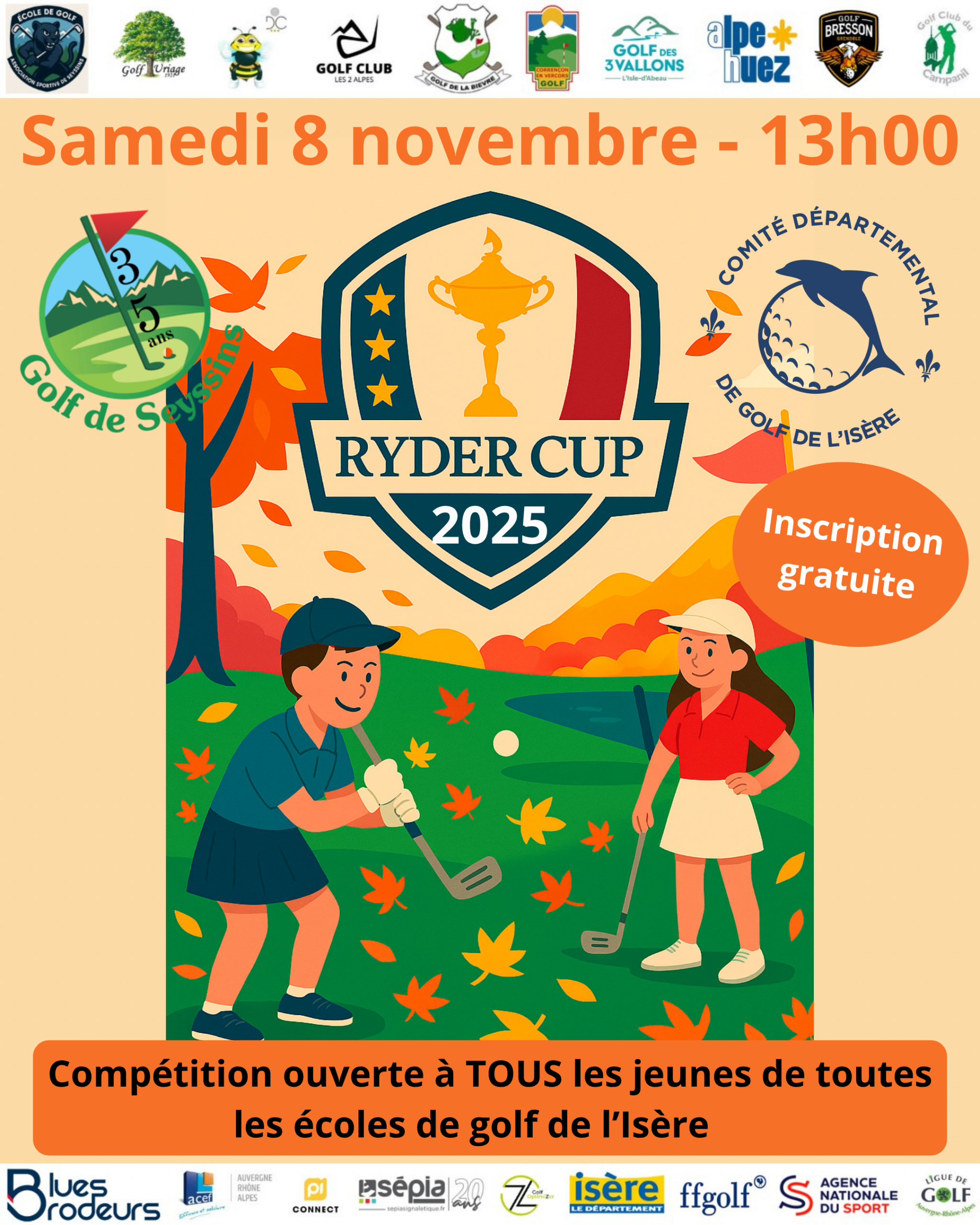 Voici les départs pour notre Ryder Cup 2025 du samedi 8 novembre au Golf BlueGreen de Seyssins. A l’issue seront remis les trophées des écoles de Golf 2025